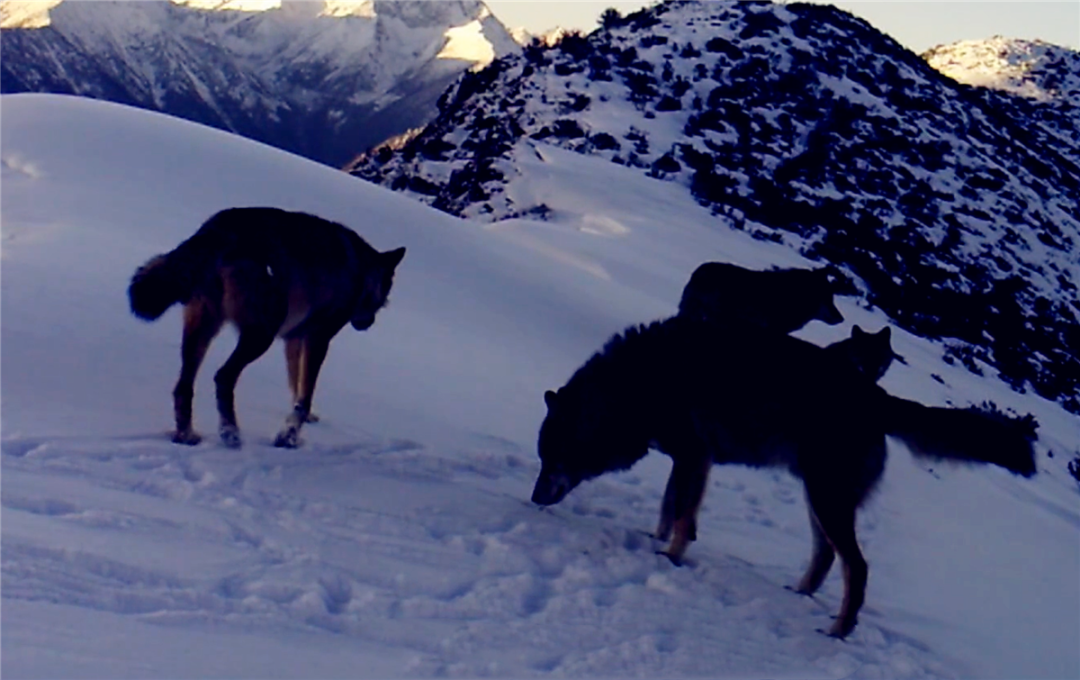 这天,4只狼出来捕猎,找了老半天,没见鹿与羊的踪迹,当它们来到一个山脊时,也许是嗅到了猞猁的气味,赶紧跑回窝去,保护自家的幼狼。