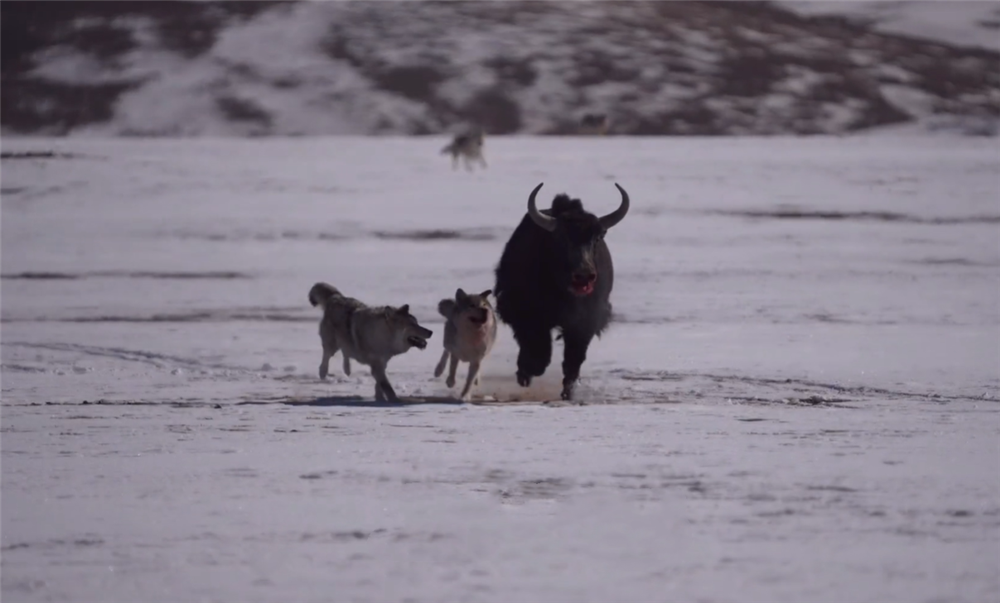 母野牦牛的身后突然又多了3只西藏狼,而且还一步步向自己逼近,这下母野牦牛有点慌了,赶紧逃跑。狼群紧追其后,一路追击野牦牛。