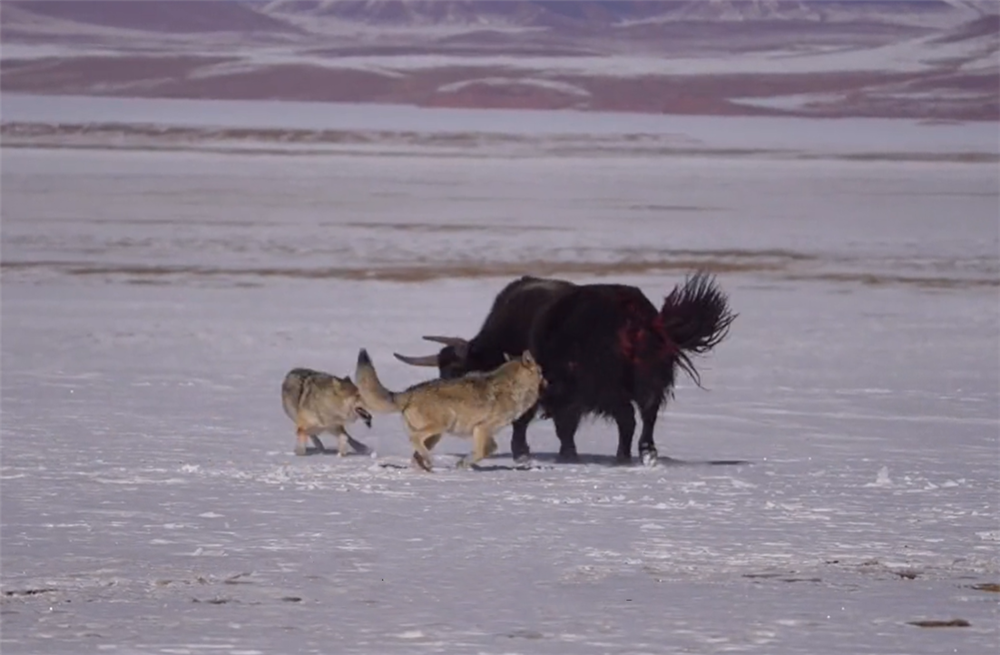 野牦牛凭着庞大的身躯与不凡的力量,让掠食动物不敢轻易对它下手。然而聪明、凶狠的西藏狼,见到野牦牛两眼放光,总想找机会吃一顿牛肉。面对一群野牦牛,狼群很难获胜,几乎没机会下手,但是面对落单的母野牦牛就有胜算了。
