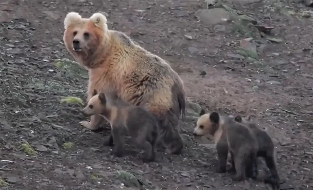 西藏棕熊追出一大段距离后,发现自己的3只幼崽没跟上来,落在后面嬉闹着打滚,根本不知道捕获食物的重要性。