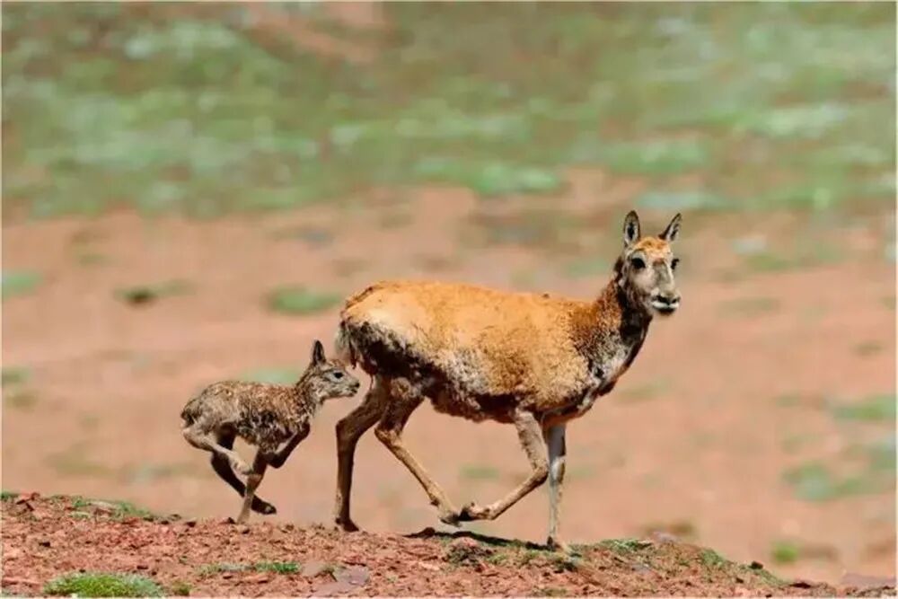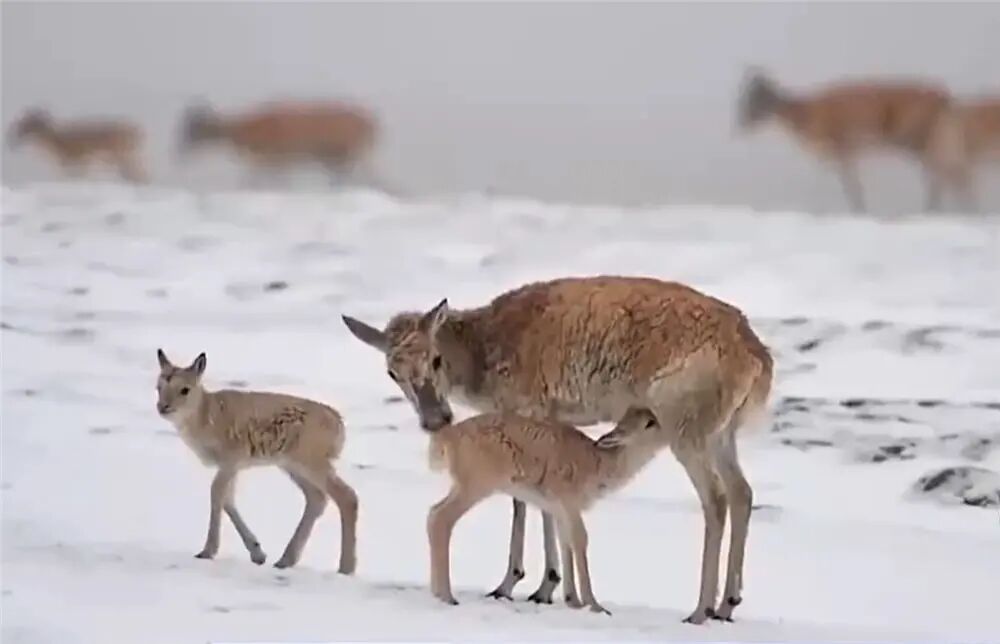 原本安静的荒原,一下子变得热闹起来,母藏羚羊照顾着幼崽,掌握着速度,让幼崽跟得上。