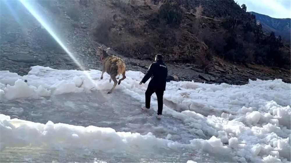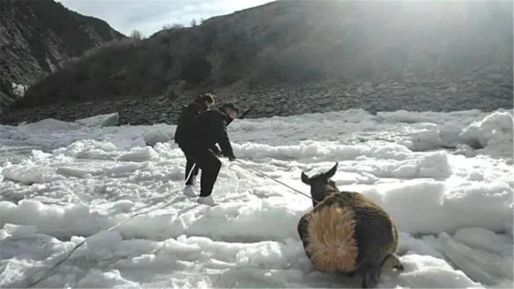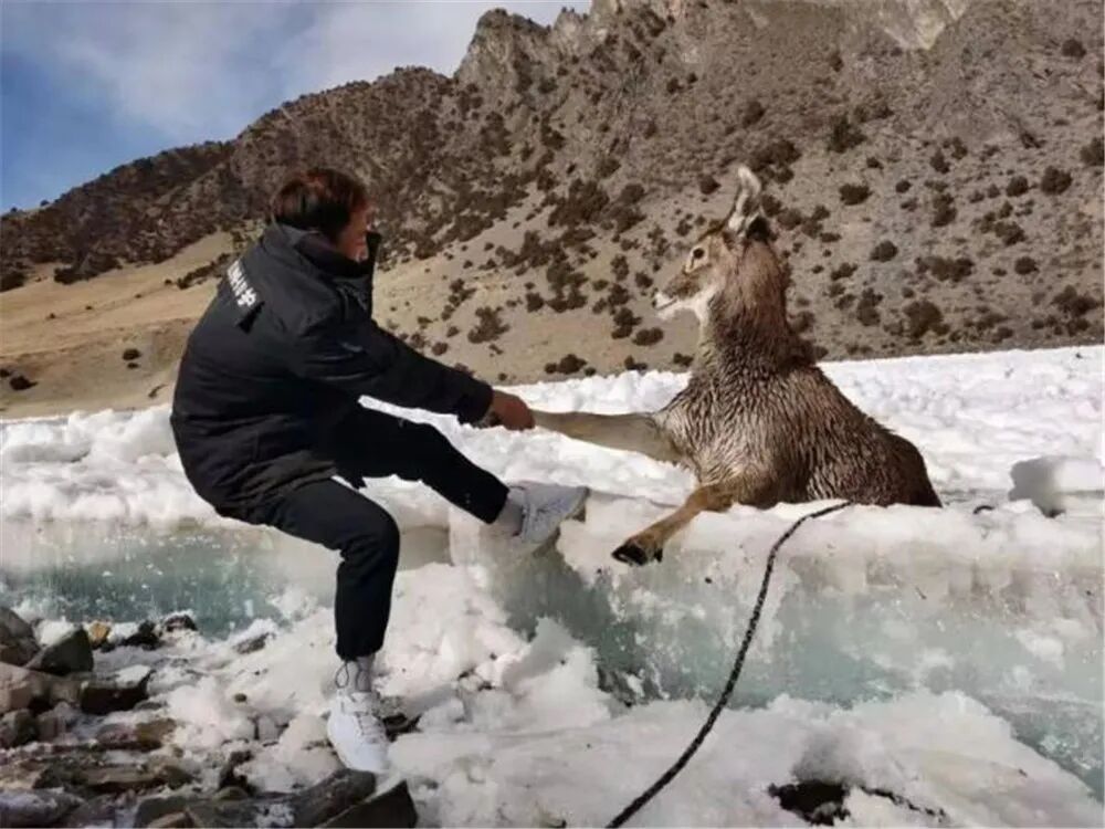 后来,几名生态管护员路过,发现了这6只白唇鹿,用绳索将它们救了上来。要说这6只白唇鹿,也算幸运,被狼追到无路可逃了,陷在冰河里,最后被人救了。