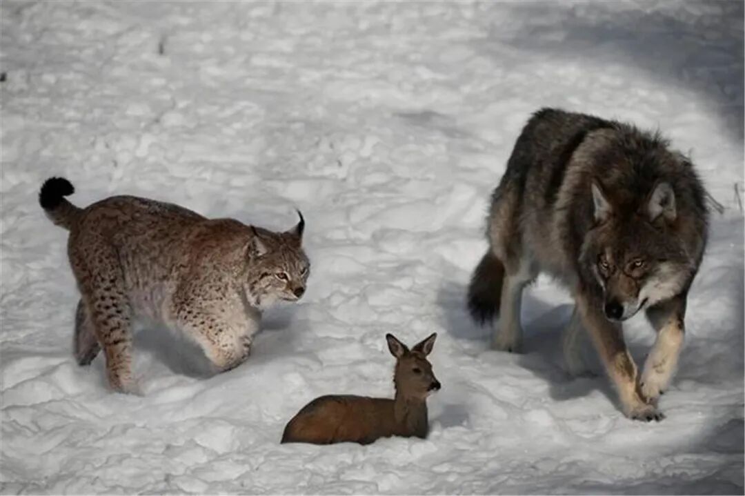 尽管狼最爱吃马鹿,而猞猁最喜欢吃狍子,但这天寒地冻的,能有肉吃那就是万幸了。等狼群赶到旁边时,猞猁的孩子也正好赶来了。狼群并没有立即扑上去抢,而是在离母猞猁20多米的地方停了下来。