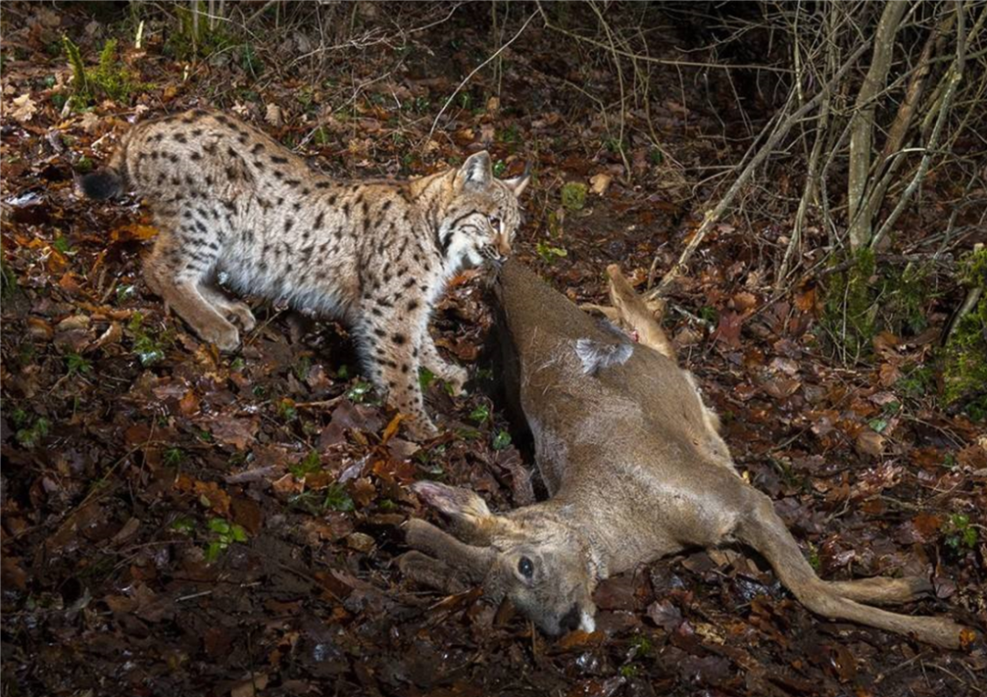母猞猁叫了几声,唤出来了2只小猞猁,它们正准备大快朵颐一番,哪知道,螳螂捕蝉黄雀在后……
