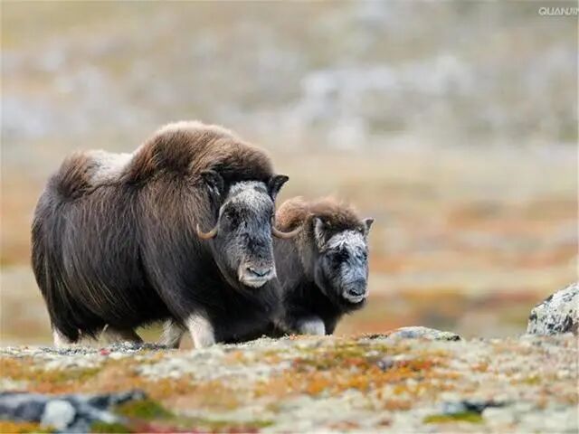 麝牛身上覆盖着一层浓密的绒毛,可御寒;外层是粗长的毛,可防风雪,所以麝牛在严寒的冬季也一点儿也不怕冷,冰天雪地里还在慢悠悠地刨雪取食苔藓类植物。