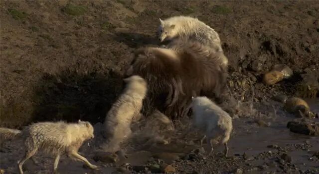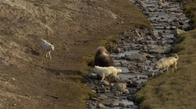 这是一场“拉锯战”,白狼想消耗尽麝牛的体力,而麝牛想用牛角去撞白狼,然后寻机逃跑。双方僵持不下,过了好一阵子,麝牛渐渐体力不支。四匹白狼联手将公麝牛捕获。