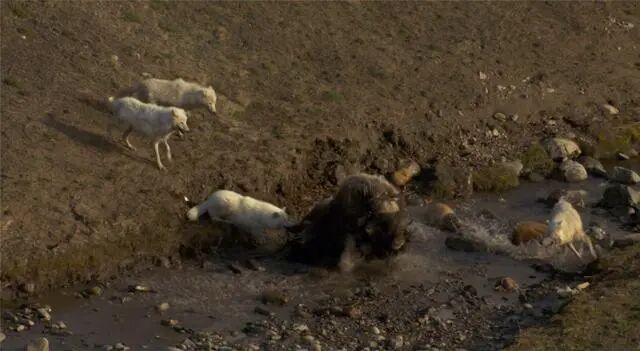 一头成年公麝牛离开麝牛群,独自在小河沟里饮水,白狼这次叫了6个帮手,一起对付公麝牛。之前的2匹白狼率先朝公麝牛走去,目光凶狠,但公麝牛似乎并不将它们放在眼里,仍然悠闲地站在小河沟里,没有逃跑。