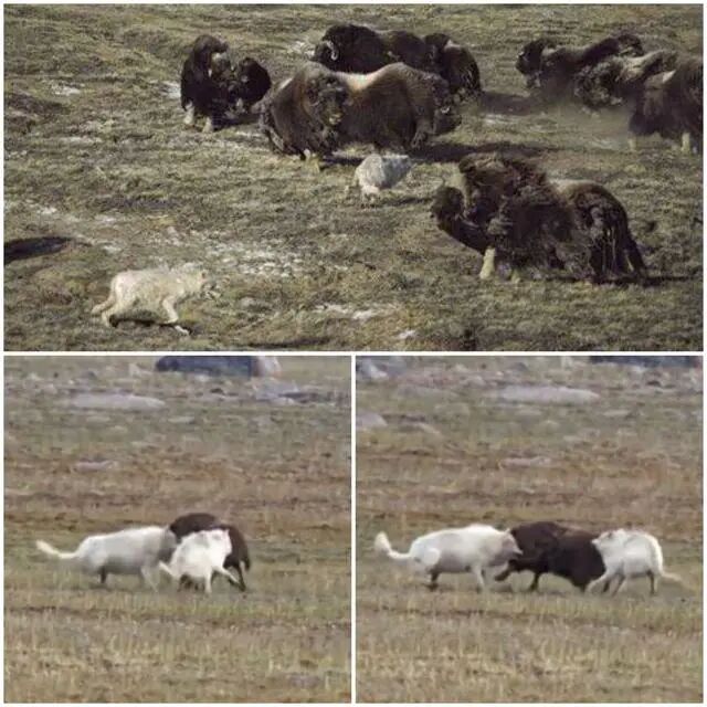 2匹白狼想抓小麝牛,反被麝牛群围攻