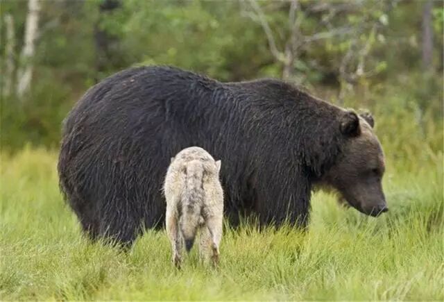 至于他们为何能走在一起,世间有很多猜测。有学者分析说,也许正是年轻和寂寞,让它们走到了一起。当寂寞的母狼遇到了孤独的公熊,那种兴奋,那种激动,无形中就成为了伴侣。