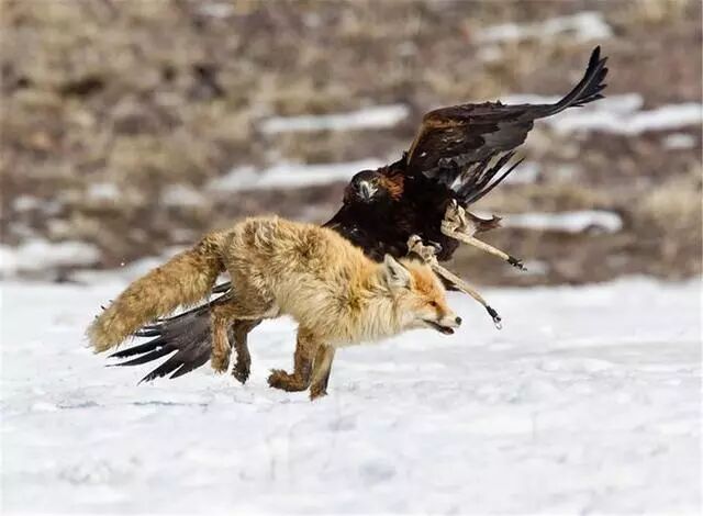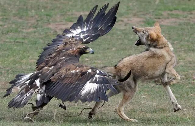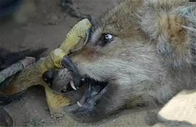 但是,猛禽的爪子扭住狼颈,借助前冲的动能把狼拉翻,顺势将另一只爪子抓住狼的口鼻,使其无法张开嘴,丧失反抗的能力,凶猛的狼挣扎了不一会儿就成为了猛禽的一顿美食。后经宁夏大学多年研究鸟类的专家们鉴定,这一大型猛禽原来是猛禽之王——金雕,至于金雕抓住的是狼还是野狗还有待研究。
