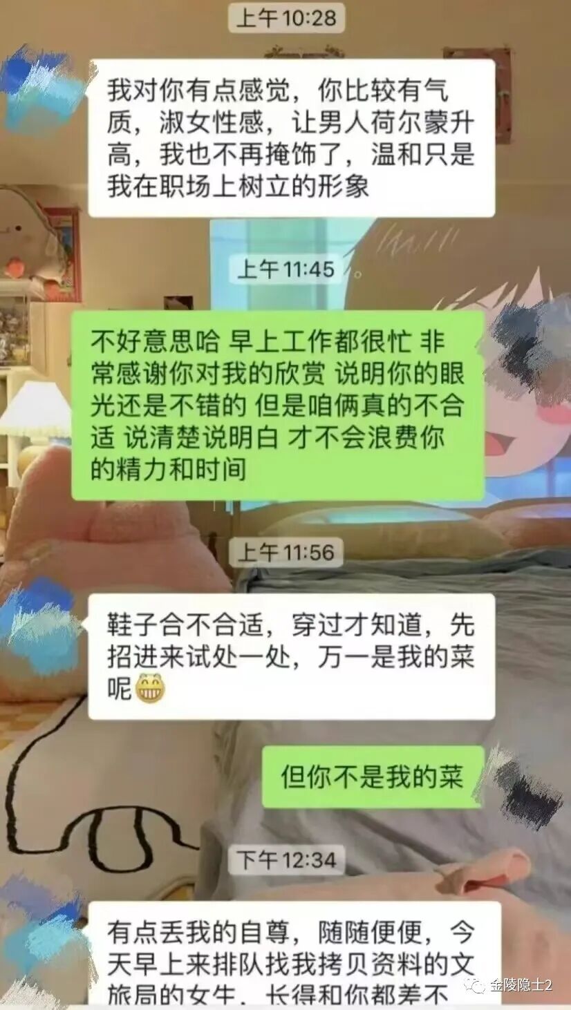 4、女方上说不合适后,男子没消化掉“委屈”表示,有点丢我自尊了。随随便便找他办事的文旅局的女生,长得就跟女方差不多。