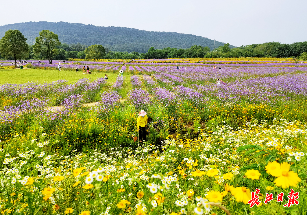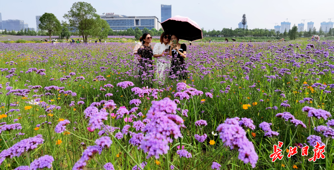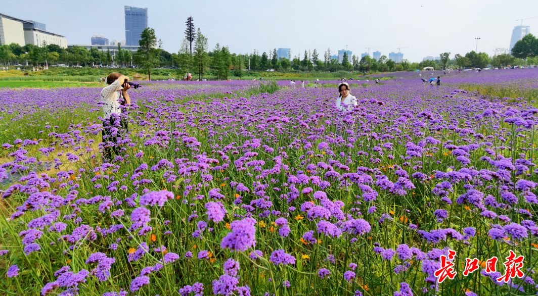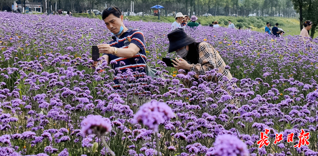 6月5日下午,长江日报记者在现场看到,大批市民在此赏花游玩。成片种植的马鞭草错落有致,每一排花丛之间有约30厘米宽的间隔,游客可以站在其中拍照留念,不用担心损坏花草。一些摄影爱好者拿出相机、无人机等设备,记录下花海美景。