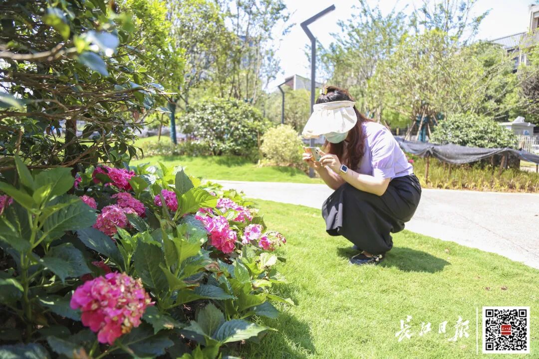 圆廊的对面是公园的绿地,由透水沥青铺装成的一条长长的步道,蜿蜒其中,不时偶遇盛放的绣球花,粉色、白色、紫色,掩映在青草地和绿树之间,有路人蹲下来拍照。