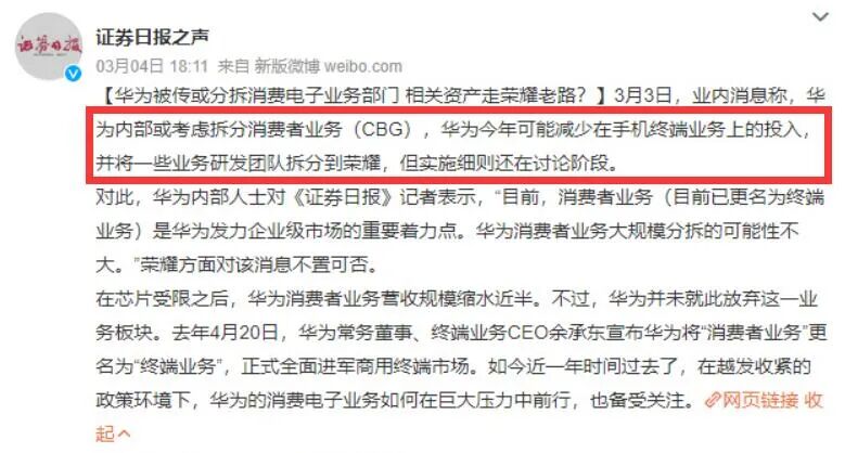 华为内部或考虑拆分消费者业务,今年可能减少在手机终端业务上的投入,并将一些业务研发团队拆分到荣耀。说得直白一点,华为或将放弃手机业务,以后可能再无华为手机。