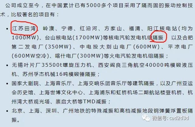 刚看到德国一个做减振产品的公司介绍,里面提到江苏田湾(连云港)核电站汽轮发电机组隔振装置用的就是他们的,当然除了连云港田湾核电站,还提到很多国内大型项目也用到了德国的减震设备,想想看,国内还真是找不到有名的减震设备供应商,我们经常喊要支持国货,但大型项目容不得半点闪失,即使国外产品价格是国内的十倍百倍,我也支持选择国外知名品牌。