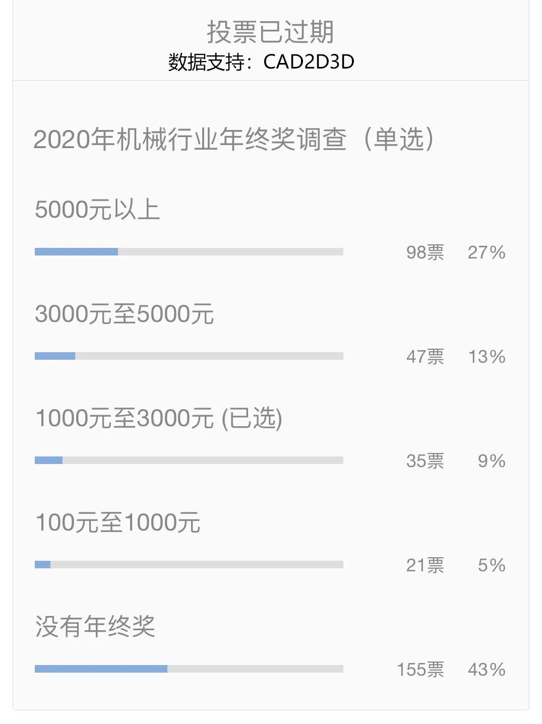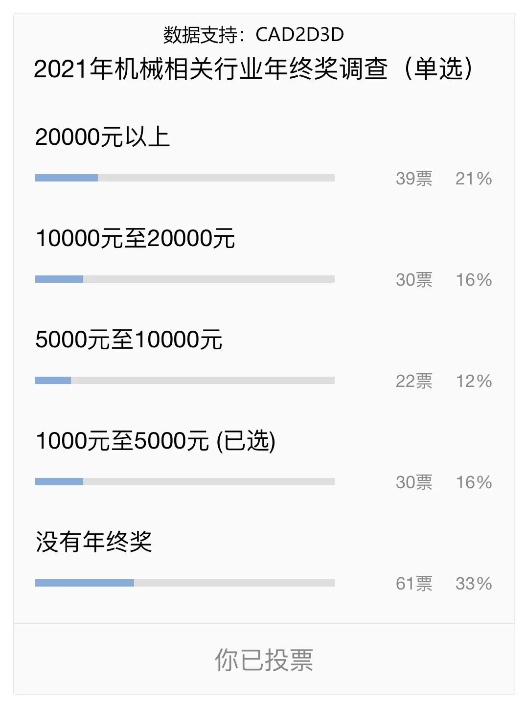 昨天做了机械相关行业的年终奖统计,具体参见:《年终奖来了,机械工程师最多5000元,不及主管1/10,搞技术的还有出路吗?》,其中20000元 以上的占比21%,10000元至20000元之间的占比16%,另外没有年终奖的占比33%,总体来看,统计数据超乎预期,相对于2020年,2021年机械行业年终奖大幅提升,具体见下图: