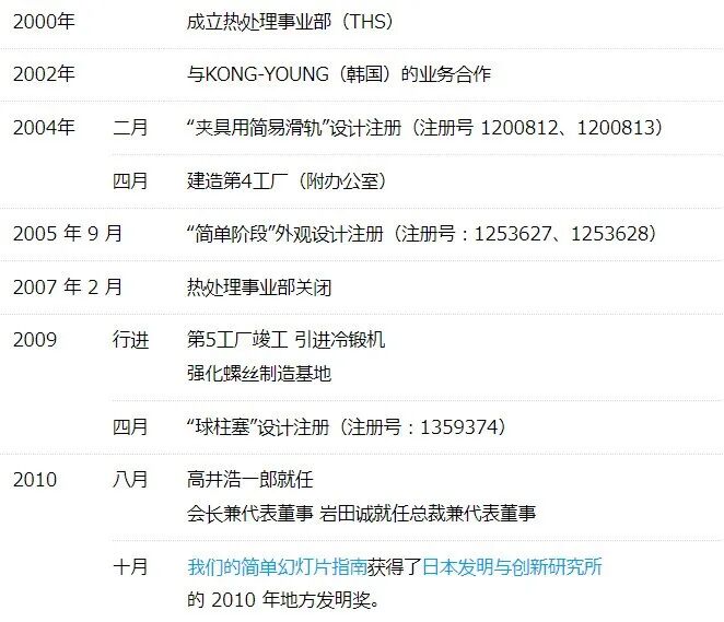 下面是这家公司的发展历程,自成立以来,主营业务一直围绕螺钉,最终将产品质量做到了极致,虽然公司规模不大,但活得很滋润。