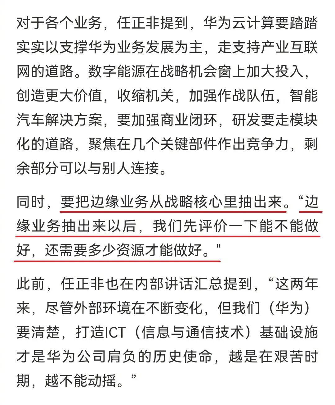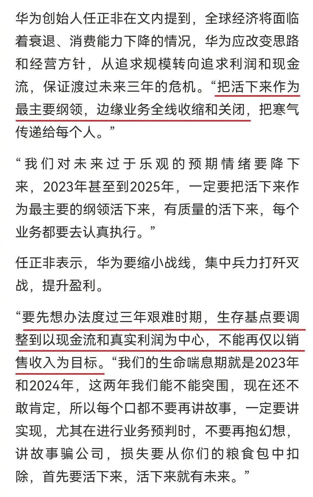 8月22日,华为创始人任正非发表内部文中《整个公司的经营方针要从追求规模转向追求利润和现金流》,文章强调将把活下来作为最主要纲领,边缘业务全线收缩和关闭,缩小战线,想办法度过三年艰难时期。