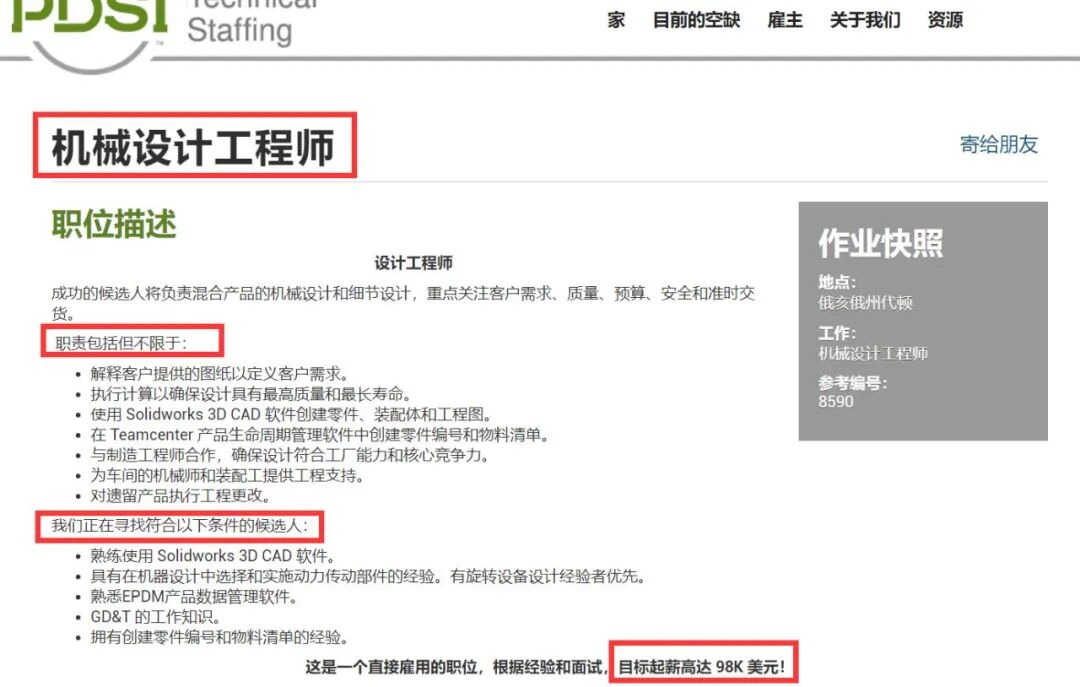 说了这么多,其实我最关心的是最后一行字——目标起薪98K美元。美国平均工资5万美元,大学教授也才10万美元,也就是说美国的机械设计工程师的收入和大学教授相当。