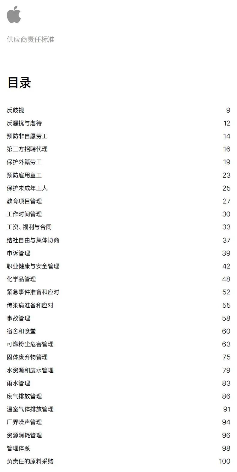 下面是苹果供应商责任标准的目录,具体内容大家自行到苹果官网查看,规定的非常详细,能把这些内容做好的,肯定都是好公司。