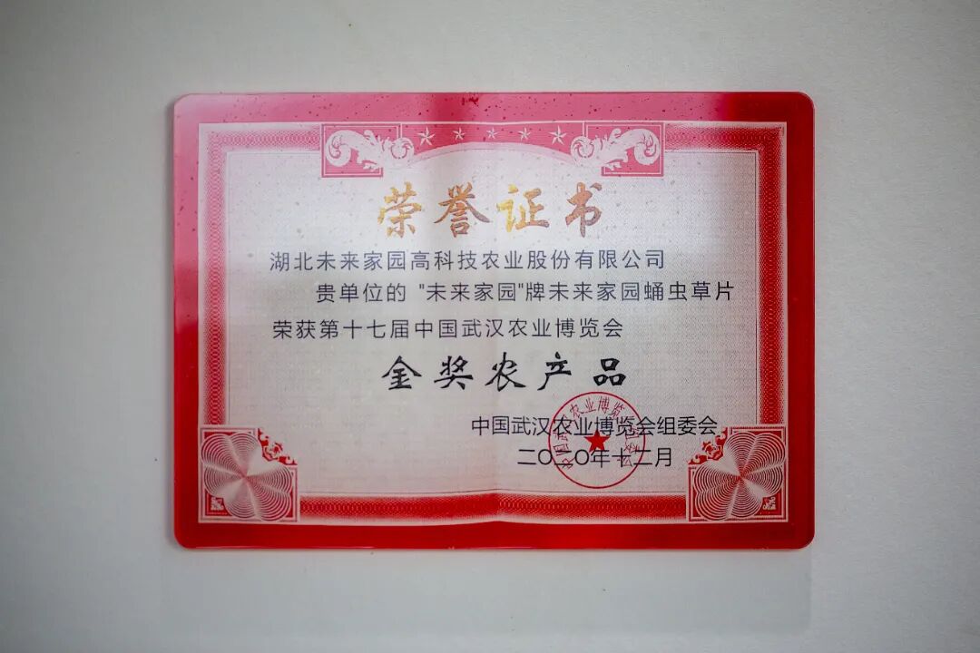 2020年12月,未来家园蛹虫草片荣获中国武汉农业博览会组委会颁发的第十七届中国武汉农业博览会“乡村振兴·科创先行 金奖农产品”;