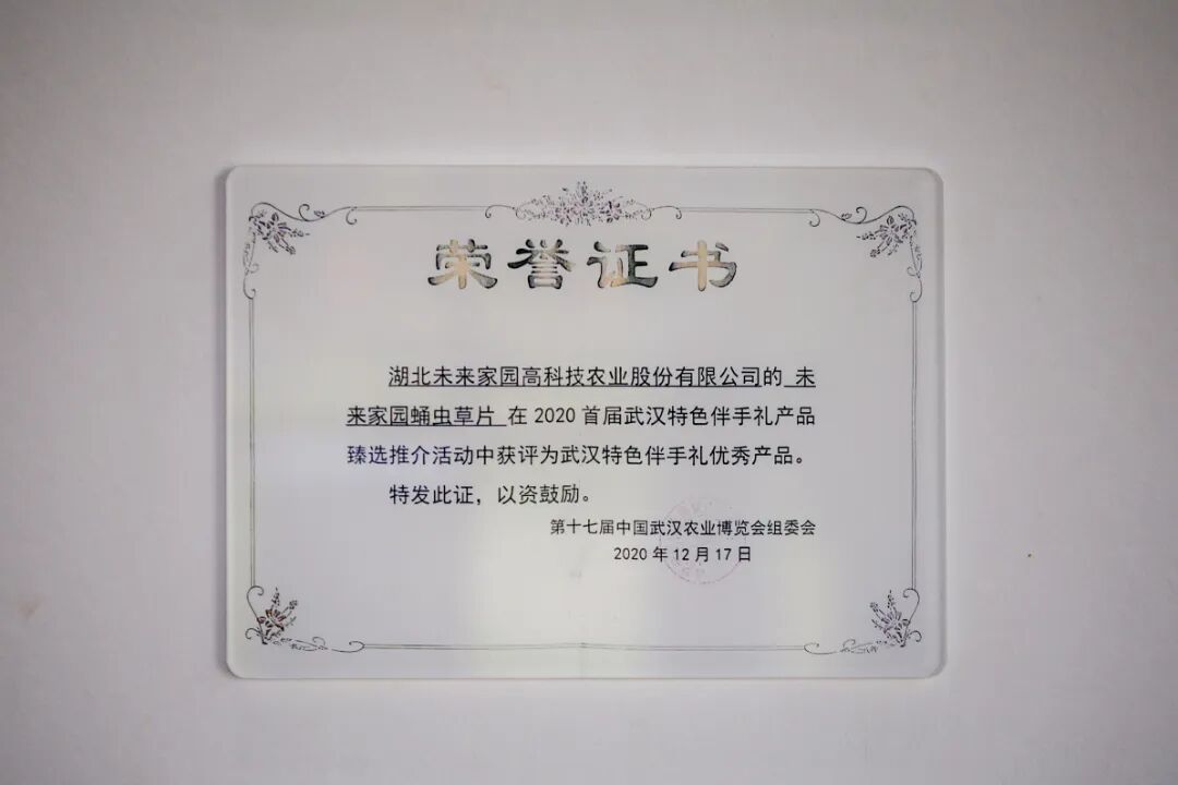 2020年12月,未来家园蛹虫草片获得第十七届中国武汉农业博览会组委会颁发的《武汉特色伴手礼优秀产品》;
