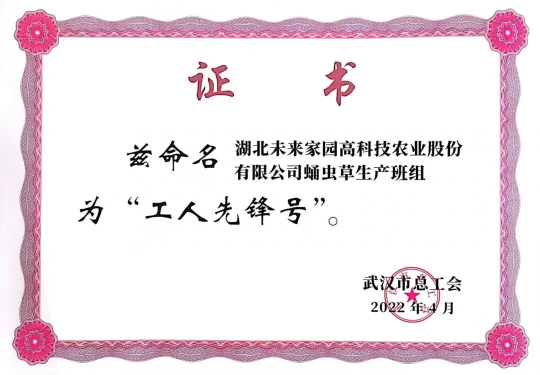 2022年4月,未来家园蛹虫草班组荣获“2021武汉市劳动生产先进班组”、“武汉市工人先锋号”。