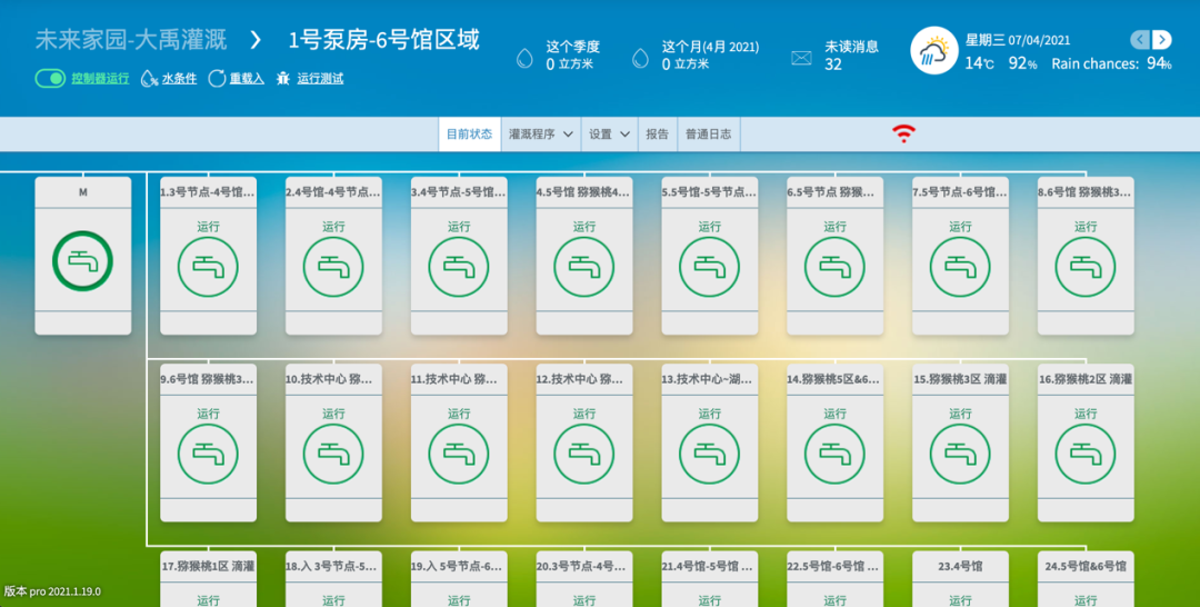 未来家园先进的系统能根据土壤墒情监测数据启动对应电磁阀启停,可精准控制灌溉时长,及判断采用哪种灌溉方式(喷灌还是滴灌)。