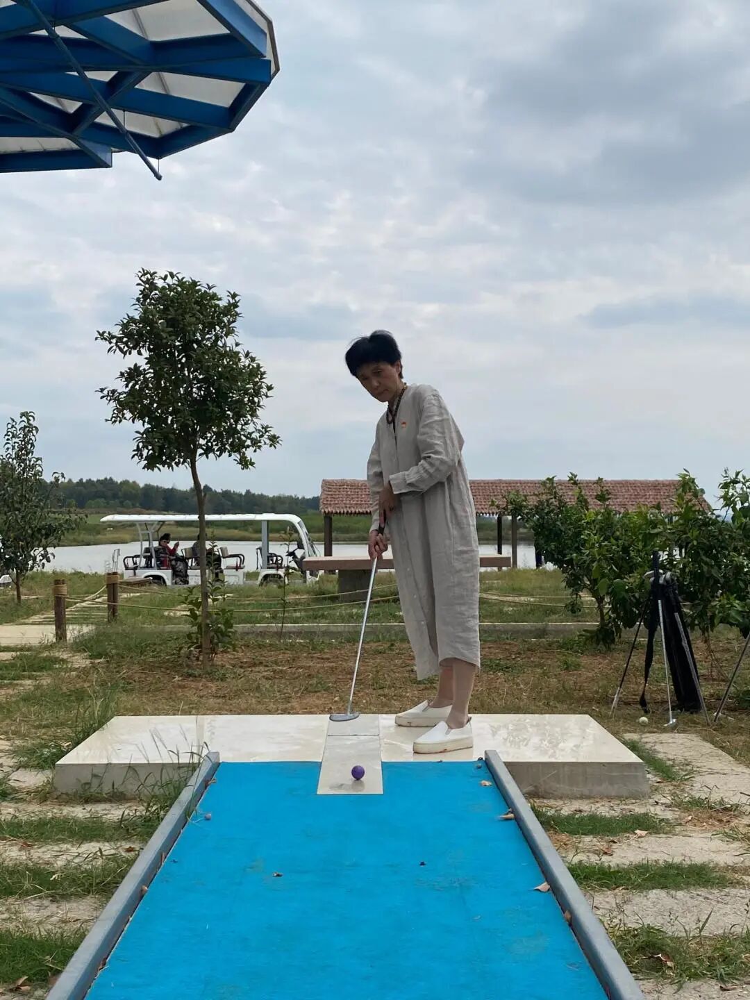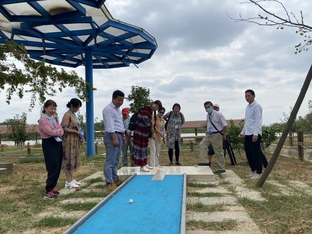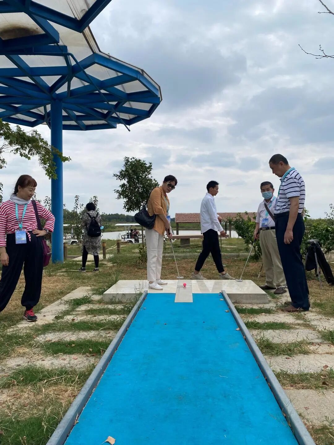 第七站,迷你高球休闲项目。沿着12公里生态湖岸线,中南民大离退休处一行来到了迷你高球运动中心,迷你高球是未来家园创新开发的休闲项目,集益智娱乐于一体。