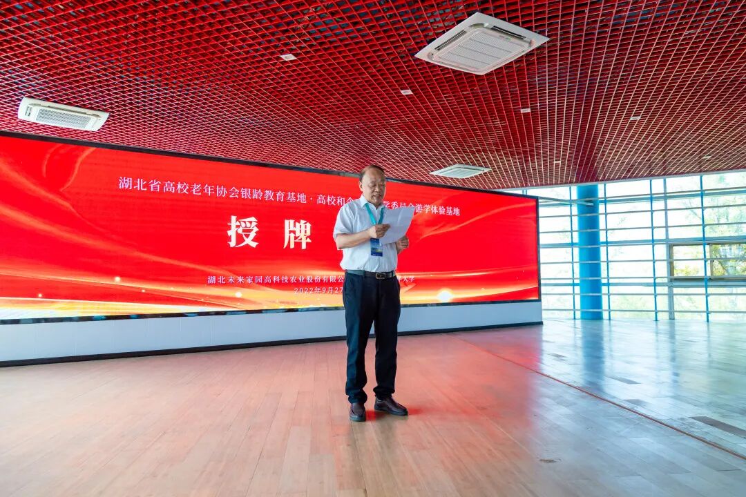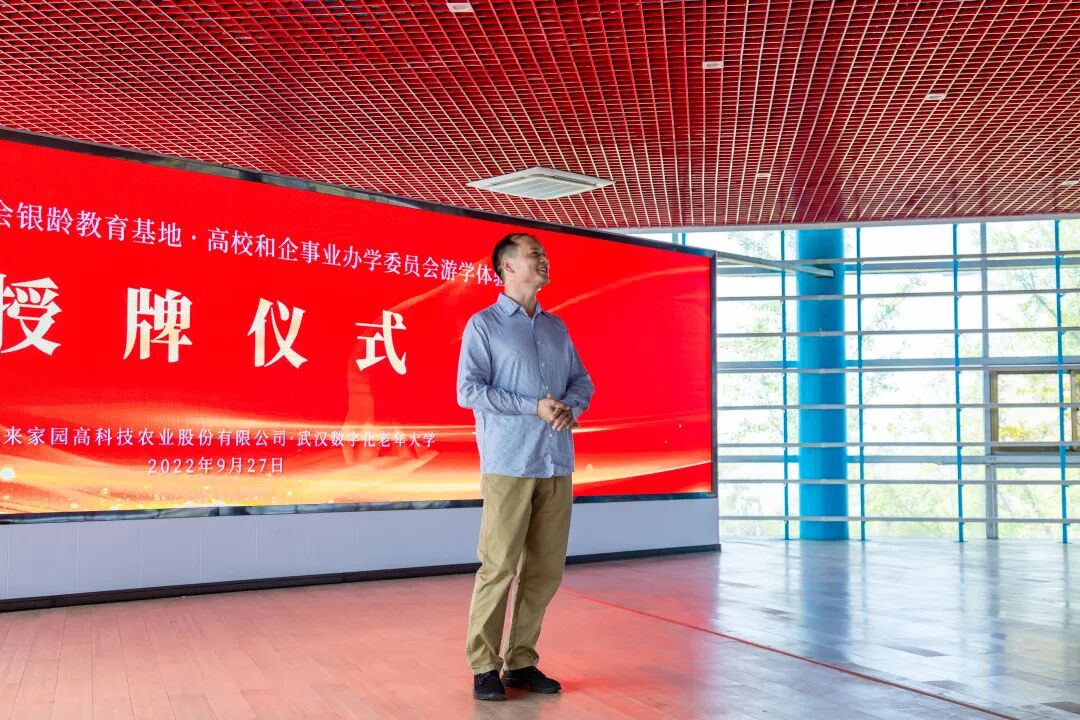 尹董表示:特别感谢在座的各位领导与嘉宾在百忙之中,共同拨冗见证我们未来家园喜获《湖北省高校老年协会银龄教育基地》、《高校和企事业办学委员会游学体验基地》,这两项荣誉基地称号的获得,是我们未来家园与武汉数字化老年大学发展史上的一个重要里程碑,将鞭策着我们继续将未来家园“创造健康,分享快乐”的理念分享给更多的中老年朋友,帮助大家在游学过程中,收获更多健康、快乐的生活方式。