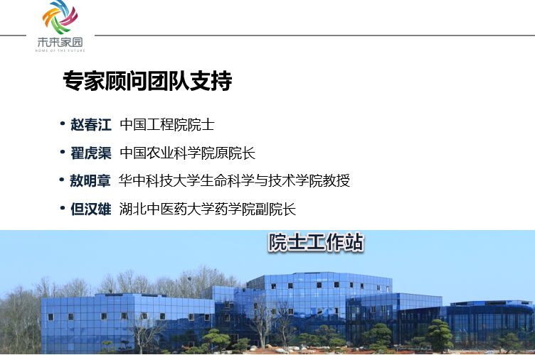 为推动三产融合高水平科学发展,未来家园还建有三个院士工作室,一个博士后流动站,十一个技术中心,聘请专家顾问12人(其中国家级带头人2人)。并与武汉大学、华中农大、中科院武汉植物所等8家科研单位签订了合作协议,与园区合作开展科技与产品研发的科技人员达数十人。园区拥有2项发明专利,8项实用新型专利,开发出了以蛹虫草、鹿茸等为代表的多个科技产品。