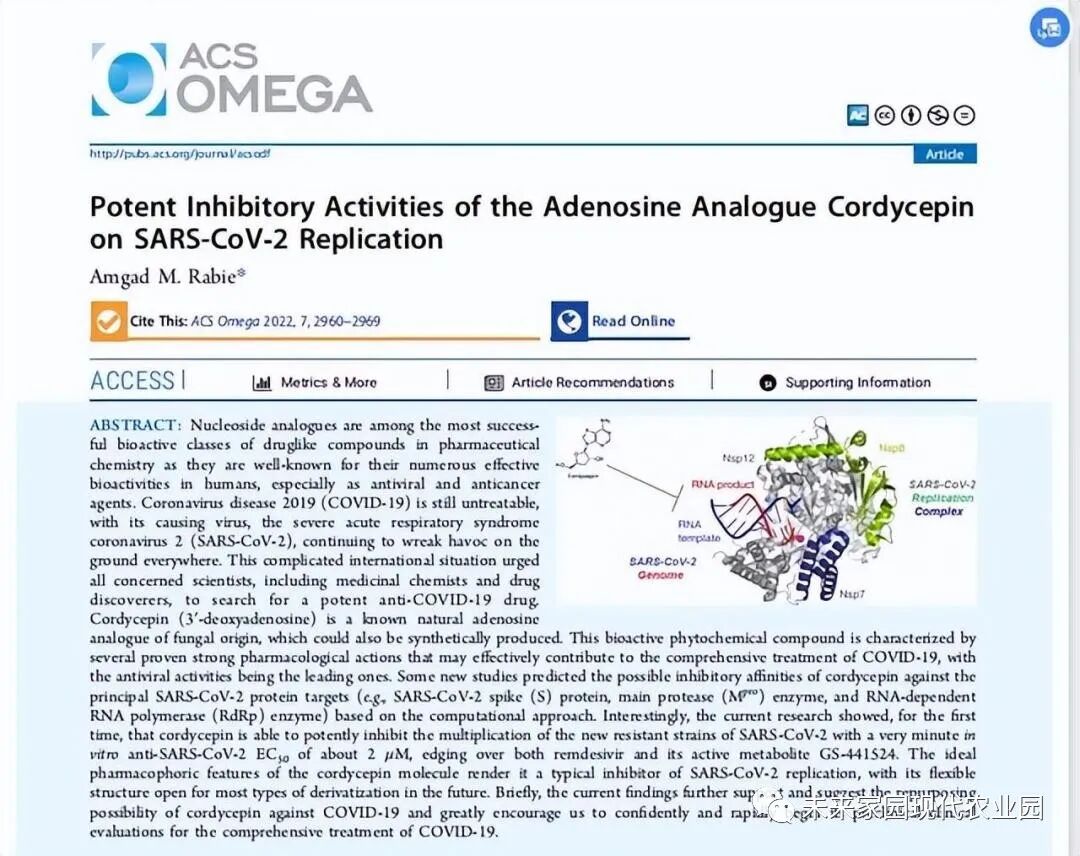 文章表明,虫草素(3'-脱氧腺苷)的抗病毒活性处于领先地位,可有效促进新冠病毒COVID- 19的综合治疗。