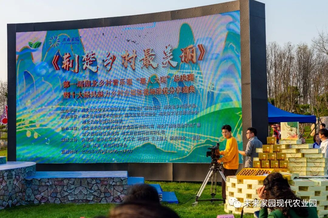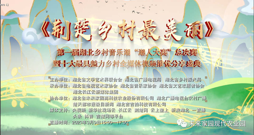 2023年3月9日下午,由湖北省文联、省广播电视局、省乡村振兴局共同主办,湖北省电视艺术家协会、湖北省音乐协会、湖北省文艺志愿者协会、湖北长江云新媒体集团承办,湖北未来家园高科技农业有限公司、湖北交通电视台农村广播、楚天都市报极目新闻等共同协办的第一届湖北乡村音乐潮“潮人大赛”总决赛暨十大最具魅力乡村全媒体视频推优分享盛典在湖北省武汉市江夏区未来家园现代农业园成功举办。