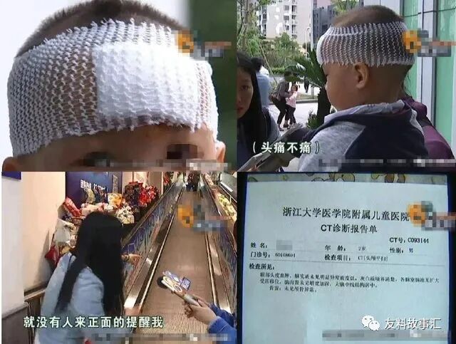 孩子飞出去了,摔在自动扶梯上,打破了他的前额。曹女士迅速抱起孩子,走下自动扶梯。其他顾客打通知超市工作人员陪她去医院。孩子被诊断为额部头皮血肿,伤口会留下疤痕。那天晚上,医疗费超过1000元。她提出让超市支付2000元,但超市拒绝了。