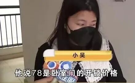 电话沟通中,开锁师傅告诉小吴,78元是开卧室锁的价格,如果是防盗门需要100块。小吴心想一百就一百吧,能把锁打开就行。随后开锁师傅就上门了,可到了以后,又说这个门锁打不开,需要撬开,撬开的费用200元。听到对方逐步加价,小吴心里已经没有底了。