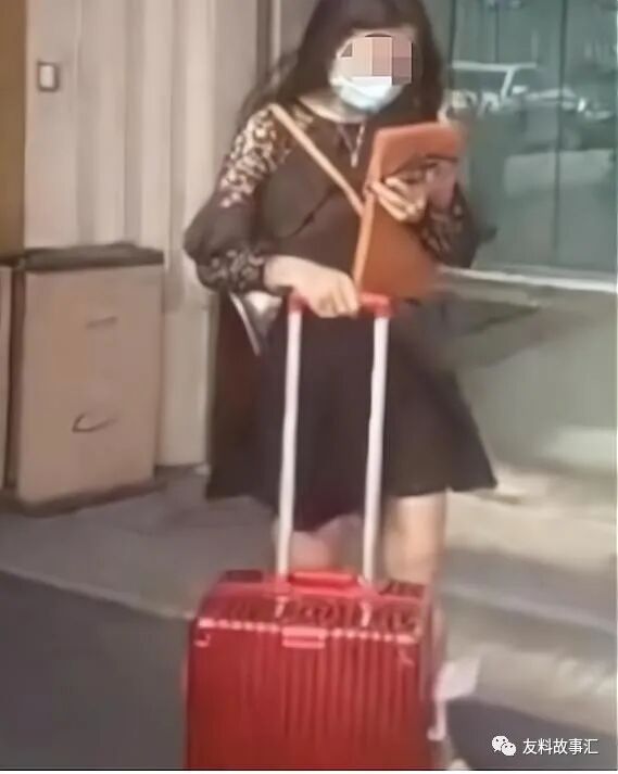 在深圳一酒店前,站着一名拖着红色行李箱的年轻女子。