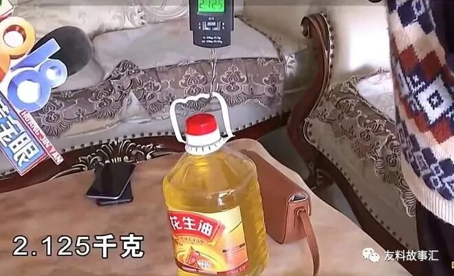 不量不知道,一量吓一跳,算上油桶的包装,一共是2.125千克,实际上4斤多一点,距离油桶上标注的5斤,查了将近一斤的重量。为了确保自己的电子秤没问题,姜女士还拿出一袋新买的大米进行测量,测量结果和包装上的斤数是一样的,所以说,她买到的花生油重量是存在偏差的。