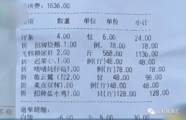这道菜不仅色香味俱全,皮皮虾也个比较大,女子虽然只点了4只,但这一桌菜也算是让一家人吃得很满意,结账的时候却懵了,服务员提供给她们的账单上面竟然写着1612元,要知道他们只点了7个菜,一桌加起来也只有5个人怎么会这么贵,仔细一看却发现,濑尿虾这道菜的价格就占了80%,共计1136元,简直离了个大谱!女子及其家人也拒绝买单,并找来了饭店的老板进行理论。