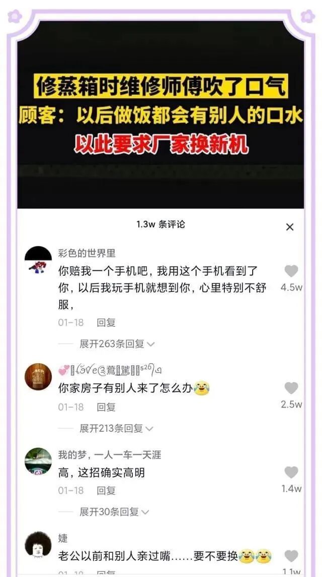 刘女士看到售后师傅用嘴对着蒸箱出水口吹气,心里极度不适,她说:“我会想到我以后用蒸箱烤箱做的每一顿饭,都会有别人的口水问题,要求重新换一个。”