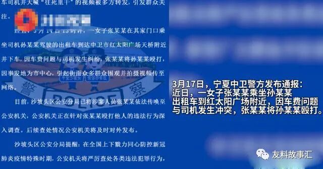 警方查明,网友发布的视频确有其事,视频中打人的女子姓张,3月14日13时许,她在家门口乘坐司机孙某驾驶的出租车到达中卫市太阳广场天桥附近并下车,因车费问题与司机发生纠纷,张某先对孙某进行殴打,后又叫来几名男子对其围殴。