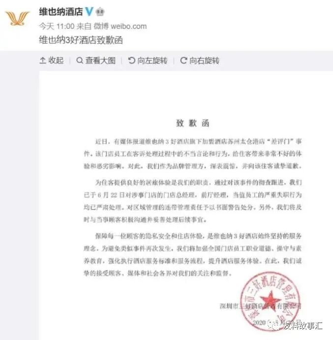 在发布的致歉函中,维也纳酒店称已对涉事门店的门店总经理,前厅经理,当值员工的严重失职行为作出严肃处理。对区域管理的连带管理责任予以书面警告处分。