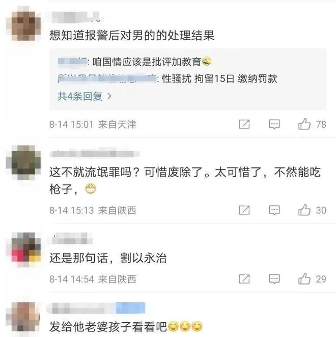 同时,也希望这些人可以约束好自己的行为,不要总是存在侥幸心理,不尊重女性,做这些流氓的行为,迟早会遭报应的,总是挑战法律的边缘,肯定也不会有什么好的下场。