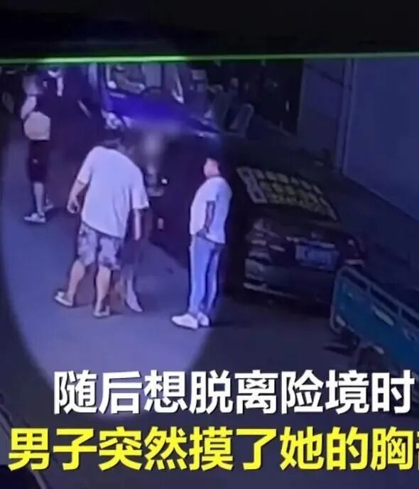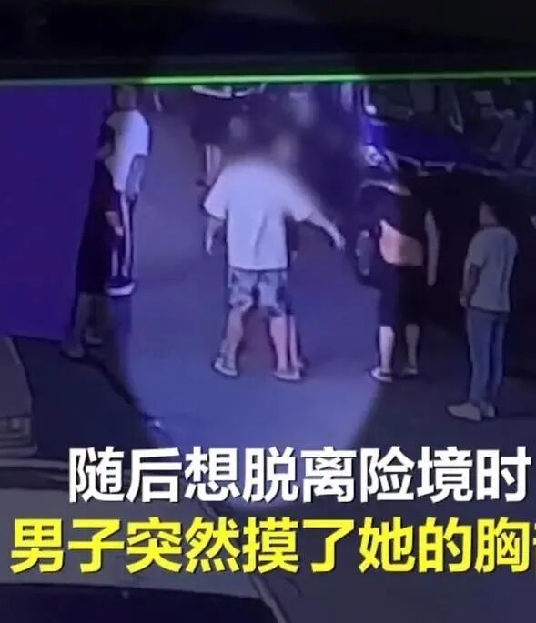 从流传到网上的视频中,我们可以清楚的看到,一名女子确实被好几个男子围住,他们似乎在言语搭讪,但是女子没有理会,想绕过他们离开,但是被一名白衣男子顺手摸了一下胸部,属实猥琐流氓。
