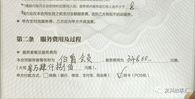 据了解,小文今年33岁,去年5月31号,她在杭州某俱乐部购买了交友服务,名为伯爵会员交友服务套餐,费用是34800元,合同期限为8个月。