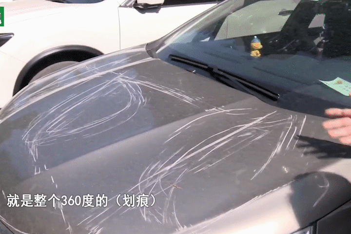 不仅前引擎爱,左右两侧以及车辆尾部,全部都被利器划伤。