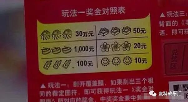 玩法一,就是9宫格里的9个图案,如果出现3个相同的图案,就可以按照下方的对照表兑换奖金,其中3个烟花的图案是30万元。