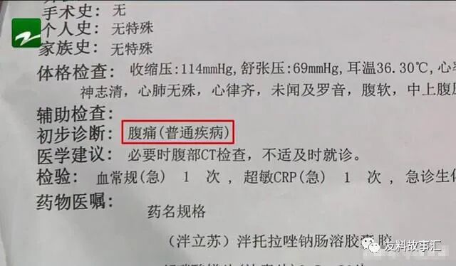 在医院经过检查,医生初步诊断为腹痛,给她开了一些药,医药费下来总共花了将近500块。