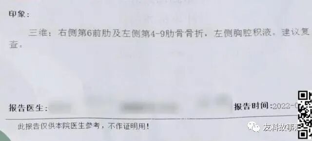 公司其他同事来拉架,鲍女士儿子乘机跑了出去,到角落里报了警。同事阻拦时,保安队长再次走过来朝躺在地上的鲍女士猛踩一脚,导致她脾脏破裂,7根勒骨骨折,其中6根严重错位,重伤二级。