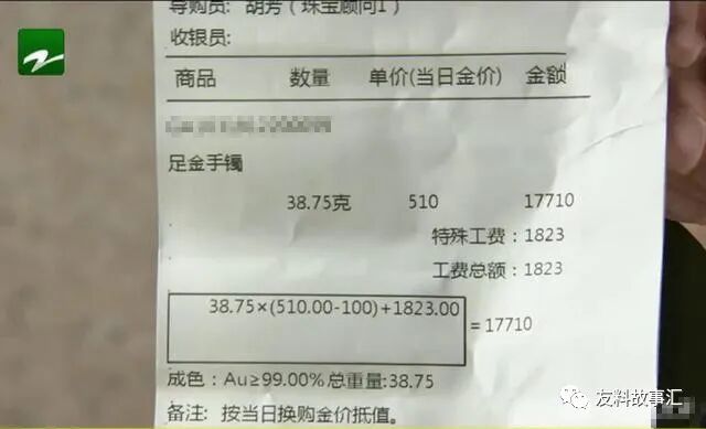 据罗女士告知,她平时喜欢戴一些足金首饰,日前她在杭州萧山银隆百货一楼的曼卡龙专柜,买了一幅足金手镯,手镯总重量大约39克,花了17000多块钱。
