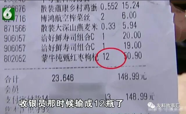 同时以这种方式结算的酸奶,还有一箱12瓶的规格。当天收银员在结账时输成12瓶了,这样就有一个11块钱差价,所以最后就算成了50块9毛。